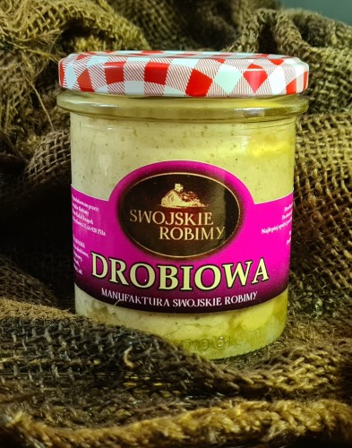 Kiełbasa słoikowa DROBIOWA Idealna do pieczywa i nie tylko, na co dzień i na piknikach. Aromatyczna, z dodatkiem naturalnych przypraw. Bazą kiełbasy drobiowej jest filet drobiowy