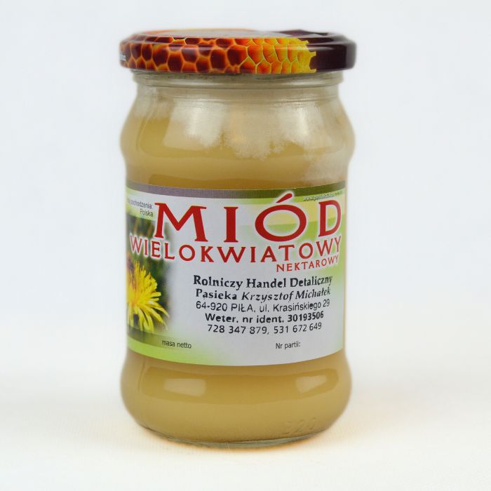 Miód wielokwiatowy, zwany „miodem tysiąca kwiatów”, to naturalny produkt o wszechstronnym działaniu wzmacniającym, przeciwbakteryjnym i przeciwzapalnym. Jest bogaty w cukry proste, witaminy (A, B1, B2, B6, B12) oraz mikroelementy, co czyni go doskonałym źródłem energii, wspierającym odporność, serce, wątrobę oraz kojącym nerwy. Idealny przy przeziębieniach i dla dzieci.